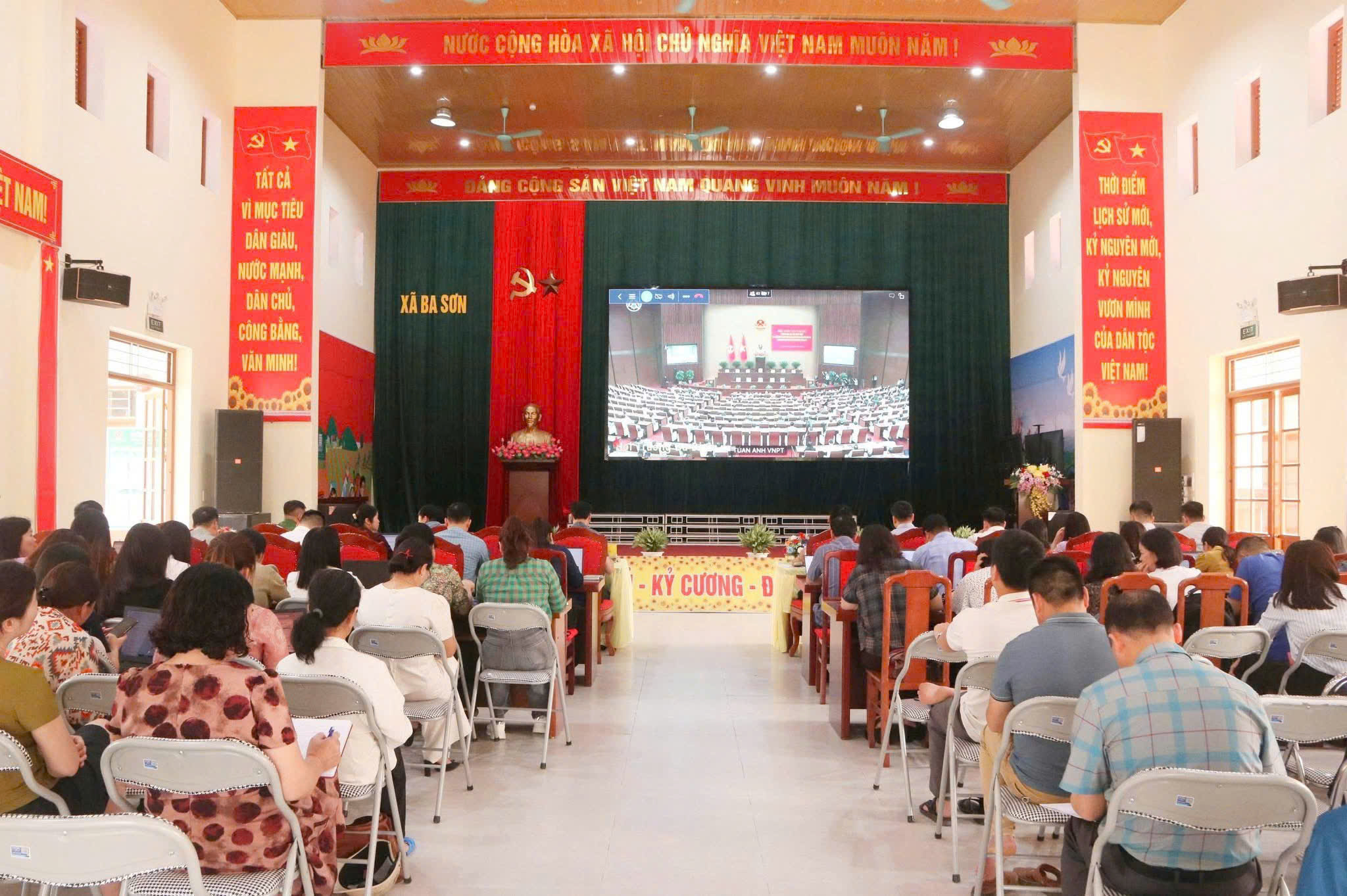 Tại điểm cầu xã Ba Sơn, dự và chỉ đạo hội nghị có đồng chí Vy Minh Long, Bí thư Đảng ủy, Chủ tịch HĐND xã; đồng chí Vũ Hoà Bình, Phó Bí thư Thường trực Đảng ủy,Chủ tịch UBND xã; Các đồng chí Uỷ viên BTV Đảng ủy; các đồng chí Uỷ viên BCH Đảng bộ xã; Các đồng chí Trưởng, Phó các phòng, ban, MTTQ, các tổ chức chính trị -xã hội, đơn vị sự nghiệp cấp xã, toàn thể cán bộ, đảng viên các cơ quan quan Đảng ủy, HĐND, UBND,Ủy ban MTTQ VN xã, Trung tâm dịch vụ Công ích xã; Bí thư, Phó bí thư chi bộ, Trưởng thôn, Phó trưởng thôn; Hiệu trưởng, Phó hiệu trưởng các trường học trên địa bàn xã.