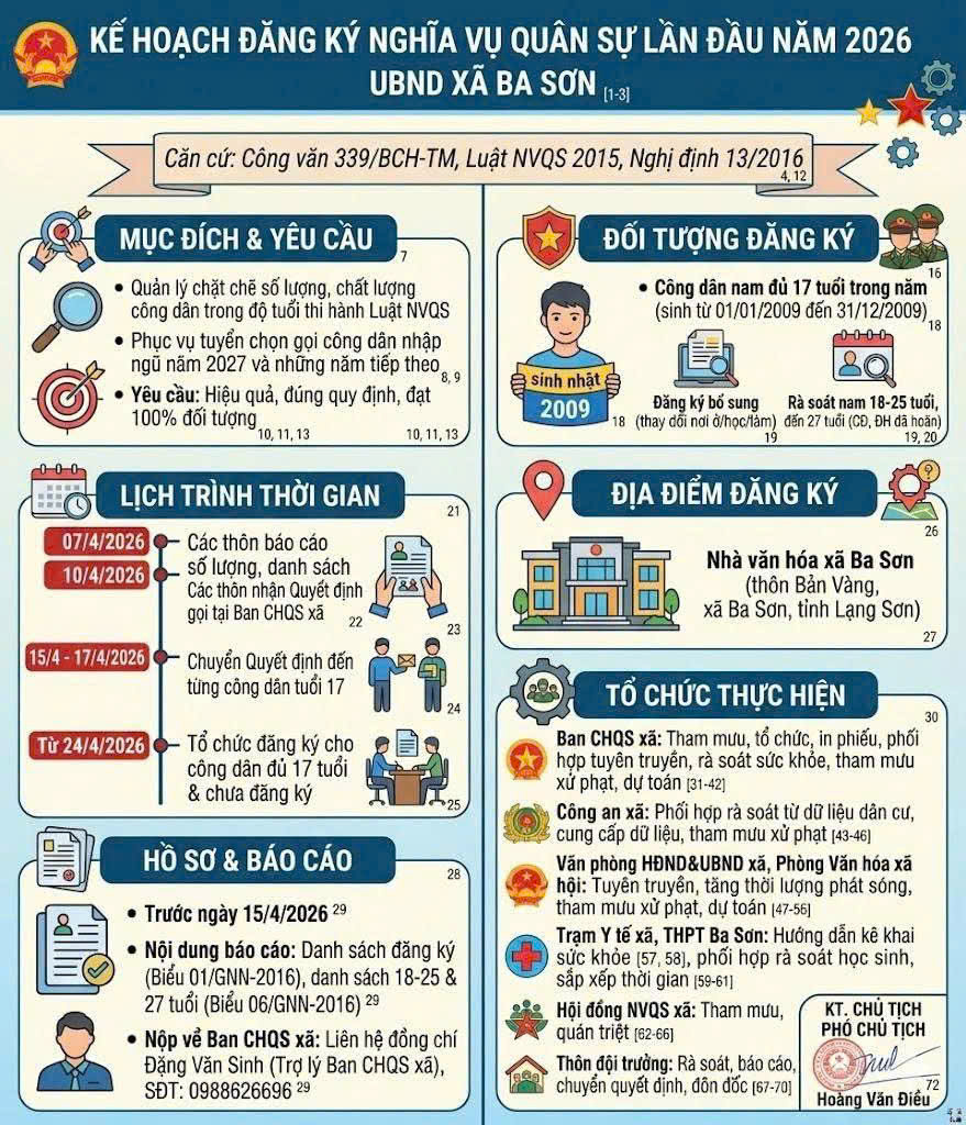 Ngày 02/4/2026, UBND xã Ba Sơn ban hành Kế hoạch số 80/KH-UBND về việc đăng ký nghĩa vụ quân sự lần đầu năm 2026. Nhằm thực hiện Công văn số 339/BCH-TM, Luật Nghĩa vụ quân sự năm 2015, Nghị định 13/2016/NĐ-CP của Chính phủ về Quy định trình tự, thủ tục đăng ký và chế độ, chính sách của công dân trong thời gian đăng ký, khám, kiểm tra sức khỏe nghĩa vụ quân sự.