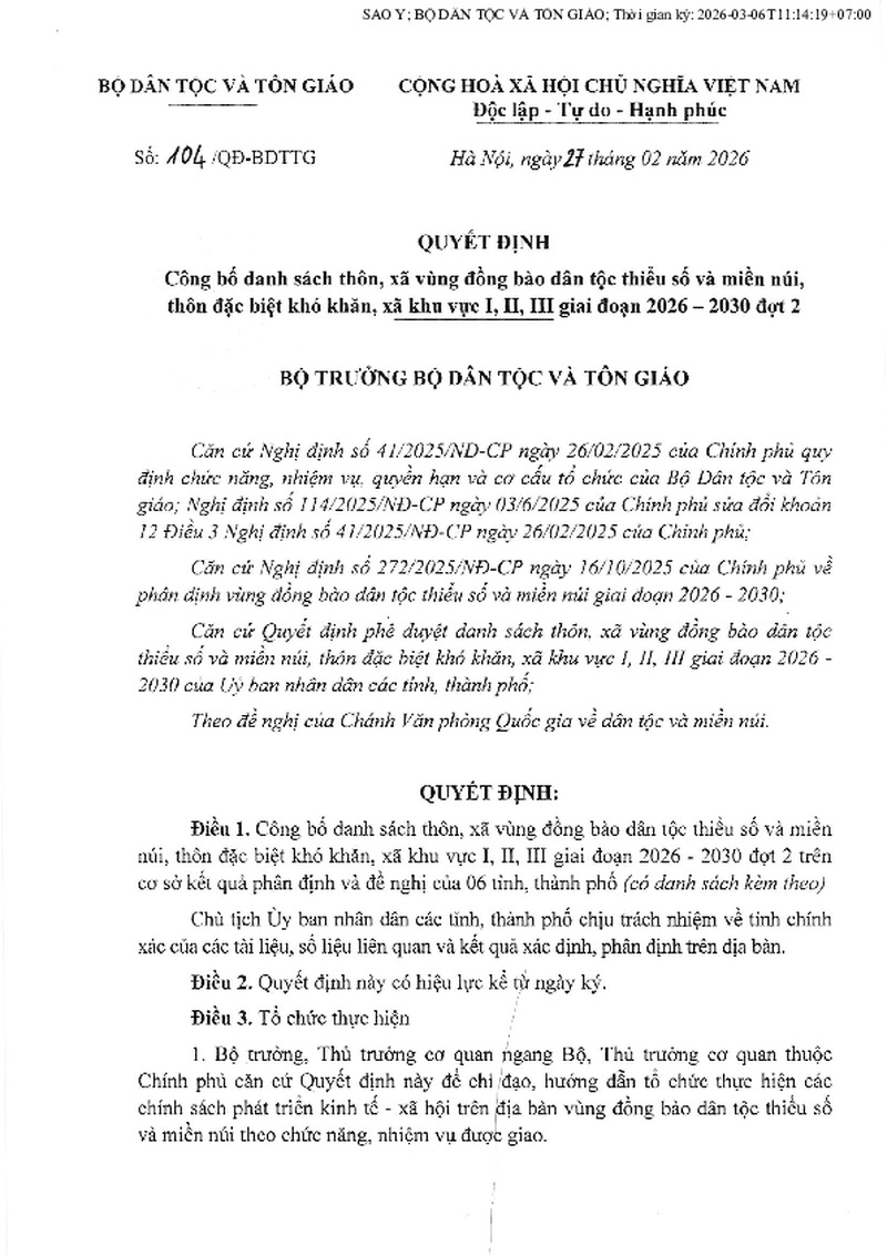 | Tiêu đề văn bản | QUYẾT ĐỊNH CÔNG BỐ DANH SÁCH THÔN, XÃ VÙNG ĐỒNG BÀO DÂN TỘC THIỂU SỐ VÀ MIỀN NÚI, THÔN ĐẶC BIỆT KHÓ KHĂN, XÃ KHU VỰC I, II, III GIAI ĐOẠN 2026 - 2030 ĐỢT 2 | ||