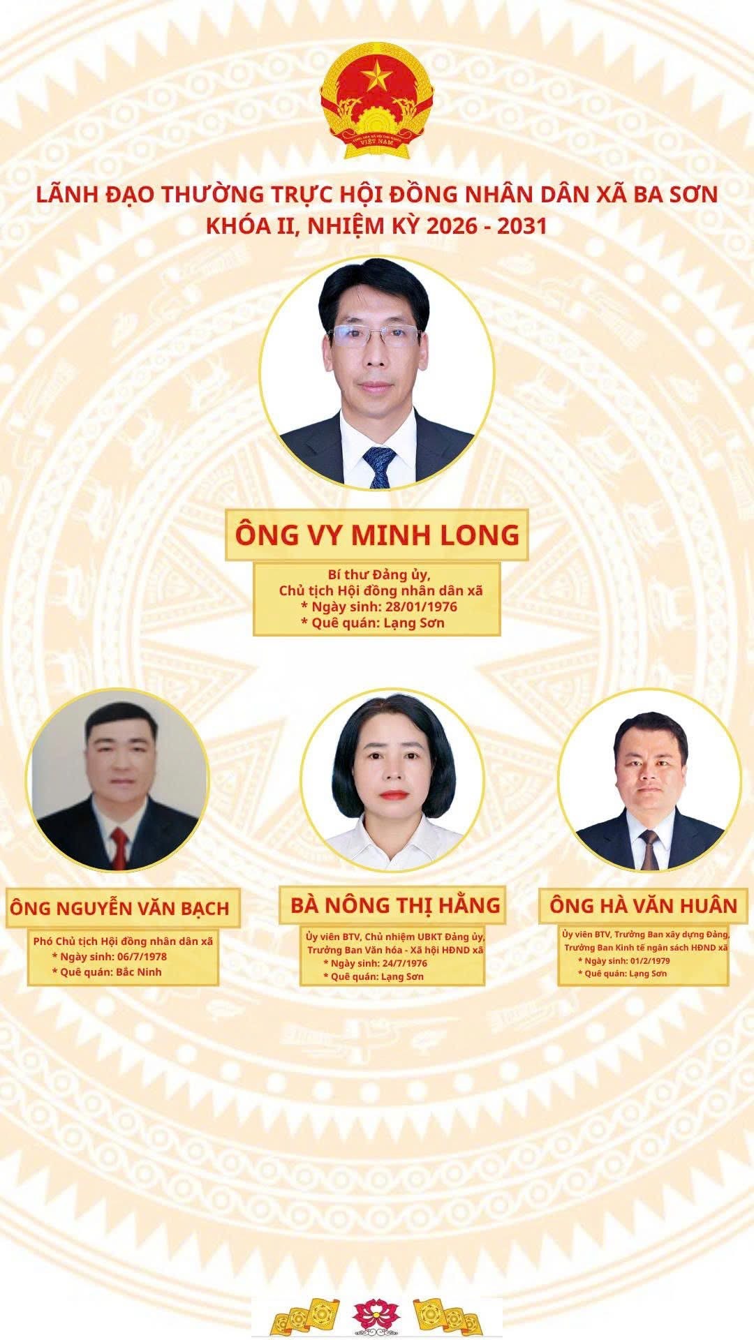 Lãnh đạo Thường trực HĐND xã Ba Sơn Khoá II nhiệm kỳ 2026-2031 gồm: